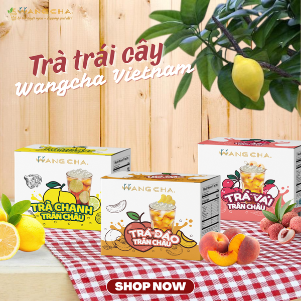 Trà trái cây Wangcha Việt Nam có 3 hương vị trái cây quen thuộc cho bạn lựa chọn là: Trà đào trân châu, trà chanh trân châu và trà vải trân châu.